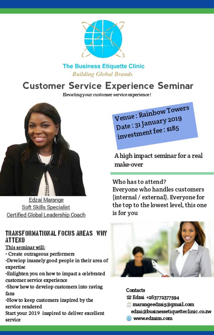 Edzai Marange is the Visionary & Founder of the first Soft Skills Laboratory in Zimbabwe- The Business Etiquette Clinic (Pvt) Ltd, an entity which specializes in Business Professional Soft Skills Training.